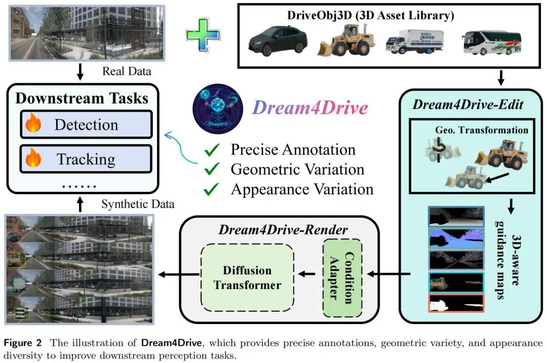 为助力未来研究,本文还构建了大规模3D资产数据集DriveObj3D,涵盖驾驶场景中的典型类别。大量实验表明,仅添加不足2%的合成数据,Dream4Drive即可持续提升下游感知任务性能,充分验证了合成数据对自动驾驶的实用价值。