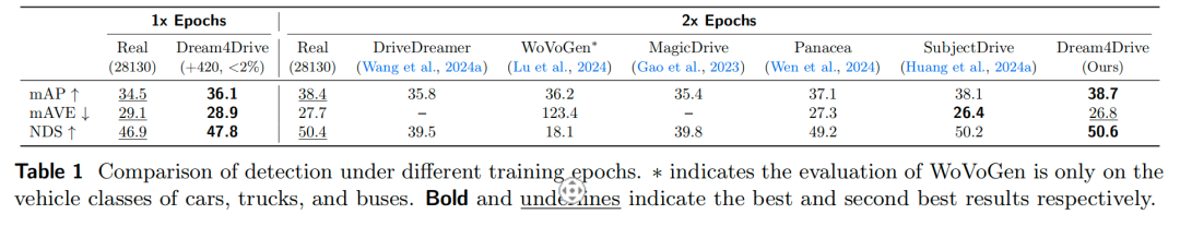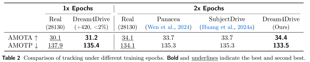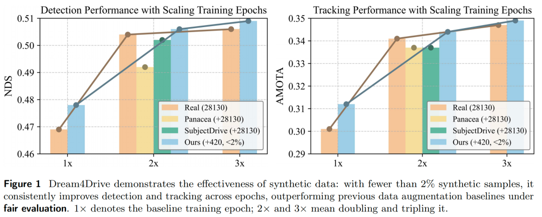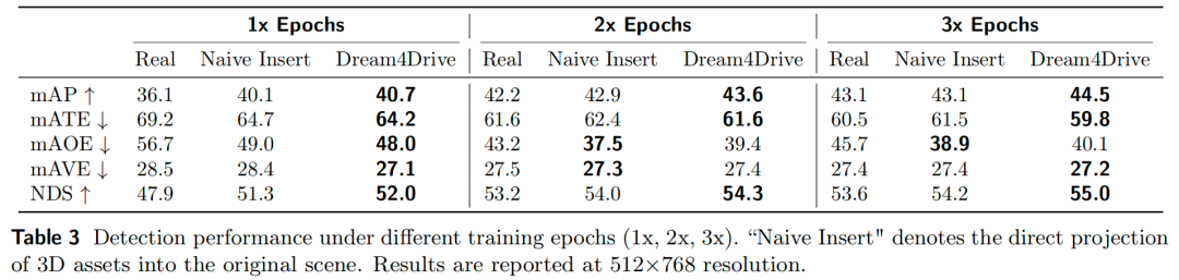不同训练轮次下的大量实验表明,仅添加极少量的合成数据,即可显著提升感知性能,充分验证了Dream4Drive的有效性。