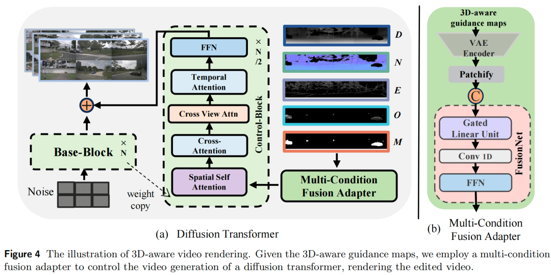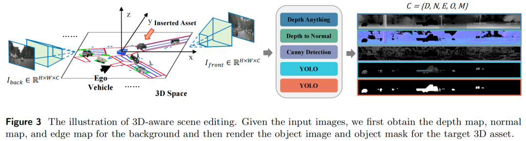 在获取背景的深度图、法向量图、边缘图以及目标3D资产的渲染目标图像和目标掩码后,我们利用微调后的自动驾驶世界模型,基于这些3D感知引导图渲染编辑后的视频。该3D感知场景编辑流程充分利用了3D资产提供的精确位姿、几何和纹理信息,确保生成结果的几何一致性。值得注意的是,本文方法不依赖3D边界框嵌入来控制目标位置,而是直接在3D空间中进行编辑,这种方式更直观且可靠性更高。