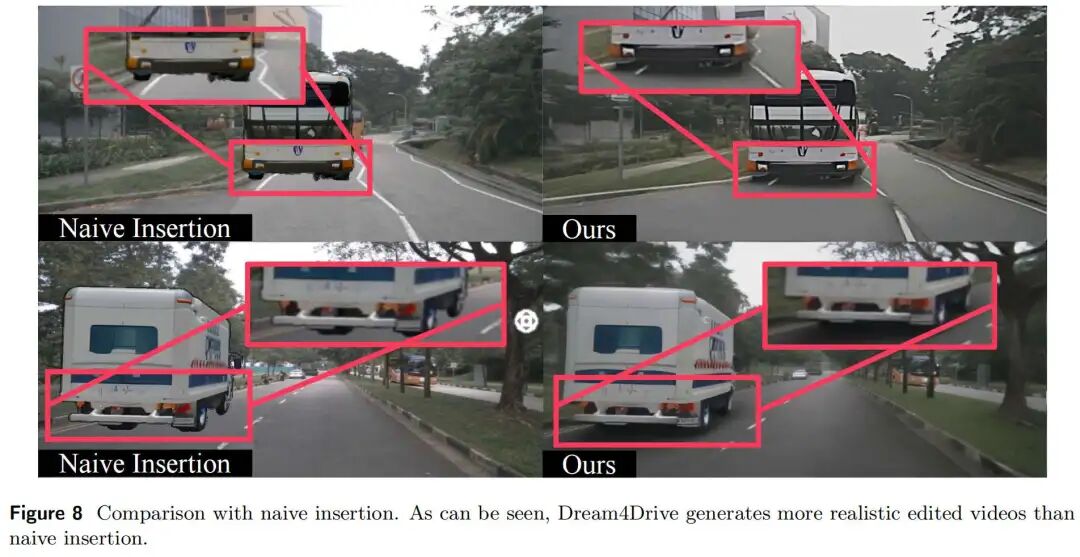图8展示了不同场景下“朴素插入”与本文生成式方法的视觉效果对比,可见Dream4Drive生成的编辑视频真实感更优。