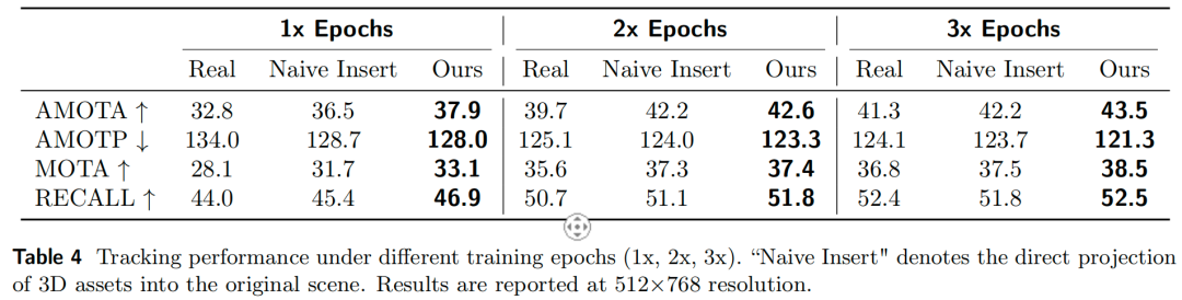 相比之下,本文方法通过在指定3D位置对目标进行显式编辑,并利用3D感知引导图指导前景-背景合成,生成标注精确的视频,可持续提升下游感知模型性能。值得注意的是,仅使用420个插入样本(不足真实样本的2%),本文方法的性能便超过了使用完整合成数据集的现有方法;更重要的是,本文首次实现了“训练轮次相同时,合成数据辅助训练的性能超越纯真实数据训练”的突破。
