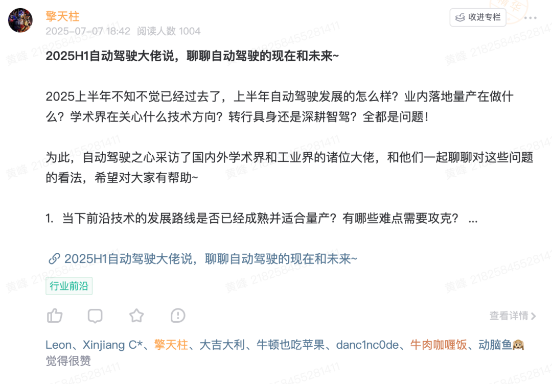 更有料的是:星球内部为大家梳理了近40+技术路线,无论你是咨询行业应用、还是要找最新的VLA benchmark、综述和学习入门路线,都能极大缩短检索时间。星球还为大家邀请了数十位自动驾驶领域嘉宾,都是活跃在一线产业界和工业界的大佬(经常出现的顶会和各类访谈中哦)。欢迎随时提问,他们将会为大家答疑解惑。除了上面的问题,我们还为大家梳理了很多其它的内容: