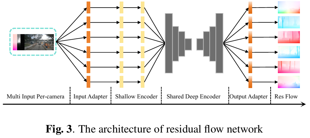 混合共享架构的残差流网络:设计“共享深度编码器+单相机解码器”结构——共享编码器学习通用运动先验,轻量化单相机解码器适配不同相机的内外参,仅预测“动态物体的非刚性运动残差”(而非完整运动场),兼顾跨视角尺度一致性与计算效率。