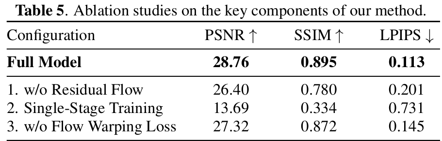 流场扭曲损失( ):去除后渲染图与动态运动的一致性下降,验证该损失对多任务协同的约束作用。