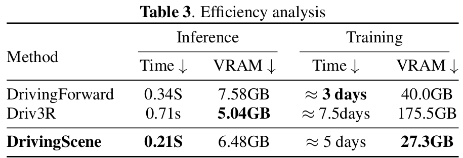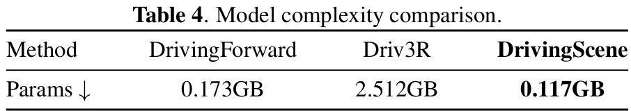 模型大小:参数0.117GB,仅为Driv3R(2.512GB)的4.6%、DrivingForward(0.173GB)的67.6%,体现轻量化优势。