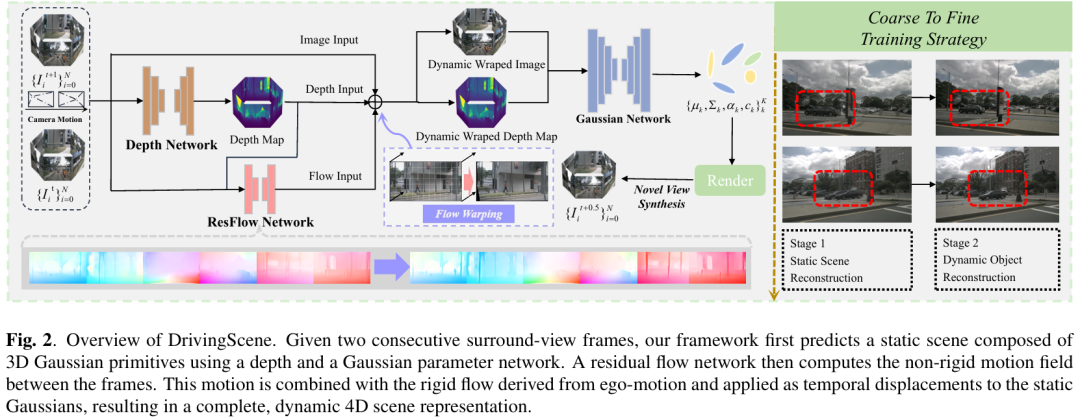 整体框架如figure 2所示:输入两帧连续环视图像,先通过静态模块生成3D高斯表示的静态场景,再通过残差流网络预测动态运动,最终融合生成4D动态场景。