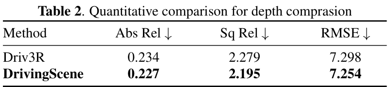 LPIPS达0.113(越低越好),虽略高于Driv3R(0.084),但综合PSNR、SSIM仍体现更优的渲染保真度。