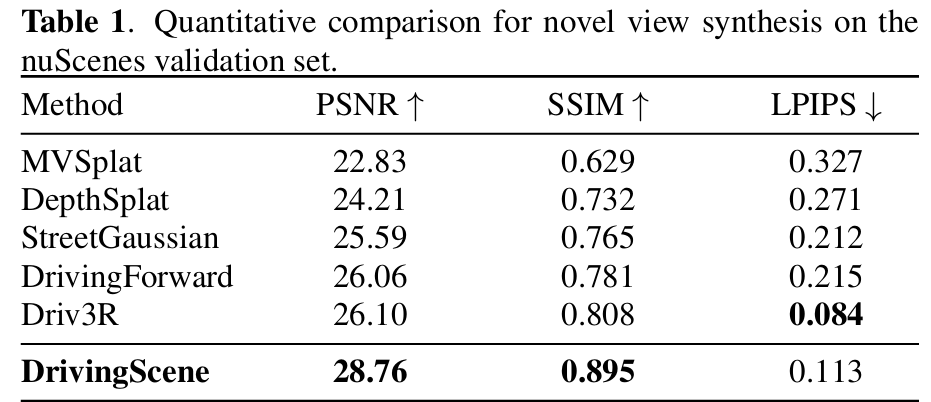PSNR达28.76,较Driv3R(26.10)提升2.66dB,较DrivingForward(26.06)提升2.7dB;