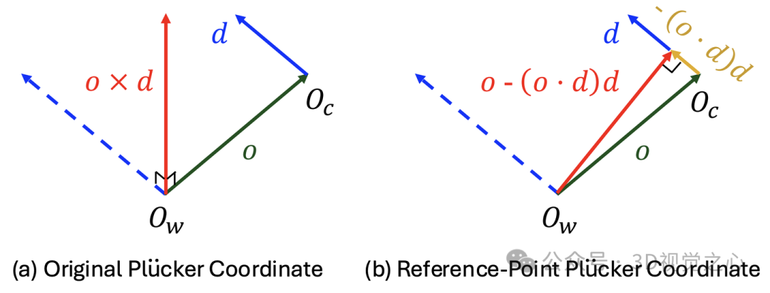 对比所示,常规的 camera conditioning 使用的是 plucker coordinate: 主要突出的是 camera pixel-aligned ray 的旋转与方向。然而空间深度的感知需要一些位置信息,为此,我们将垂直于相机相机射线的最近点位置向量作为参考点输入到模型当中,借助 Transformer 的残差结构能将这个参考点信息传递到模型的所有层当中。如图 12 (b) 所示,我们的 Reference-Point Plucker Coordinate (RPPC)公式如下: