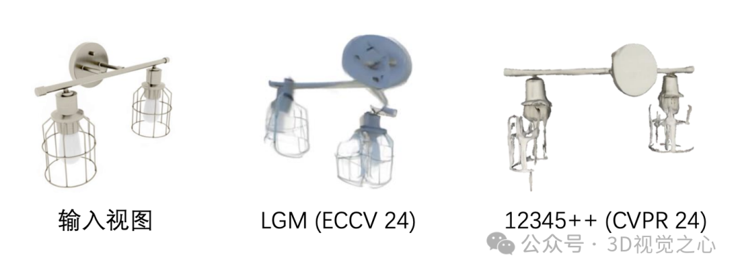 3D Gaussian Splatting (3DGS)。这类方法存在诸多问题,首先是multi-view 生成阶段的三维视角一致性没办法保证,这容易导致根据重建得到的三维表征渲染出来的新视角图像产生伪影和畸变,如图10中的两个经典工作 LGM (ECCV 2024) 和 12345++ (CVPR 2024) 所示。
