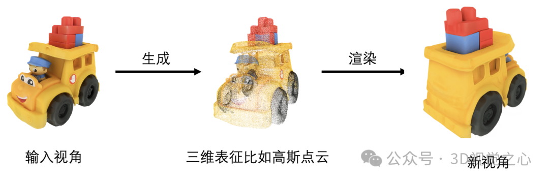 首先来介绍我们研究的任务 —— 图像到三维的生成(Image-to-3D Generation)。如图 8 所示,给定一张输入视角图像,Image-to-3D 会生成对应的三维表征,这种三维表征可能是显式的如三维高斯点云(3D Gaussian point clouds)或者网格(Mesh),也可能是隐式的如神经辐射场(Neural Radiance Fields,NeRF)。然后根据生成的三维表征转换视角进行渲染就能够得到指定新视角下的图像。