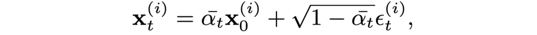 我们的 Diffusion 也是一个 multi-view diffusion,不过与之前的 multi-view diffusion 不同的地方在于 (1) 是 pixel space 的,(2) 将 3DGS 点云嵌入其中来增强三维视角的一致性。首先,在训练阶段,我们模型的输入是一张干净图像和 N 张噪声图像,以及这 N+1 张图像对应的相机位姿。前向过程就是逐步对 N 个视角加噪声如下:
