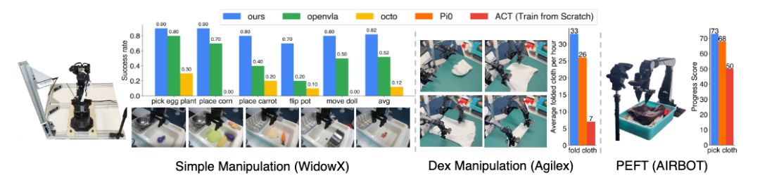 在真实的机器人平台上,X-VLA在大量简单抓取和桌面操作任务中展现了强大性能,并成功完成了无限时长的自主叠衣任务,展示了其应对复杂长程任务的卓越能力。