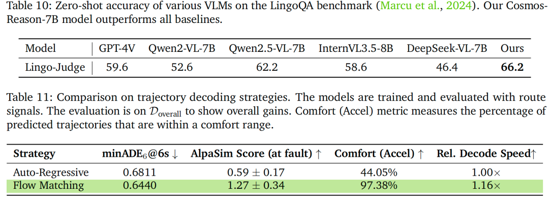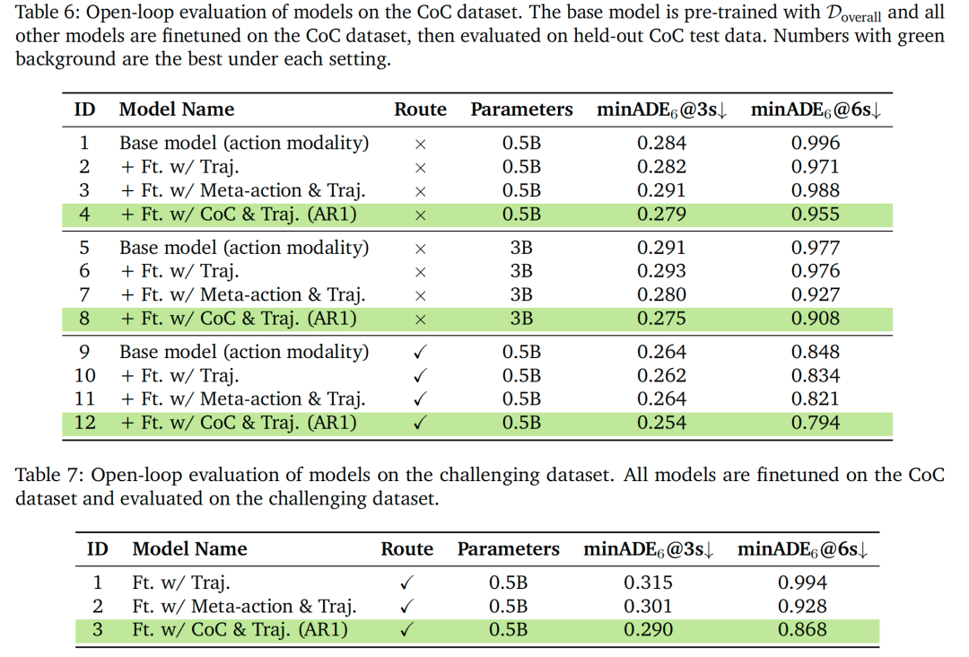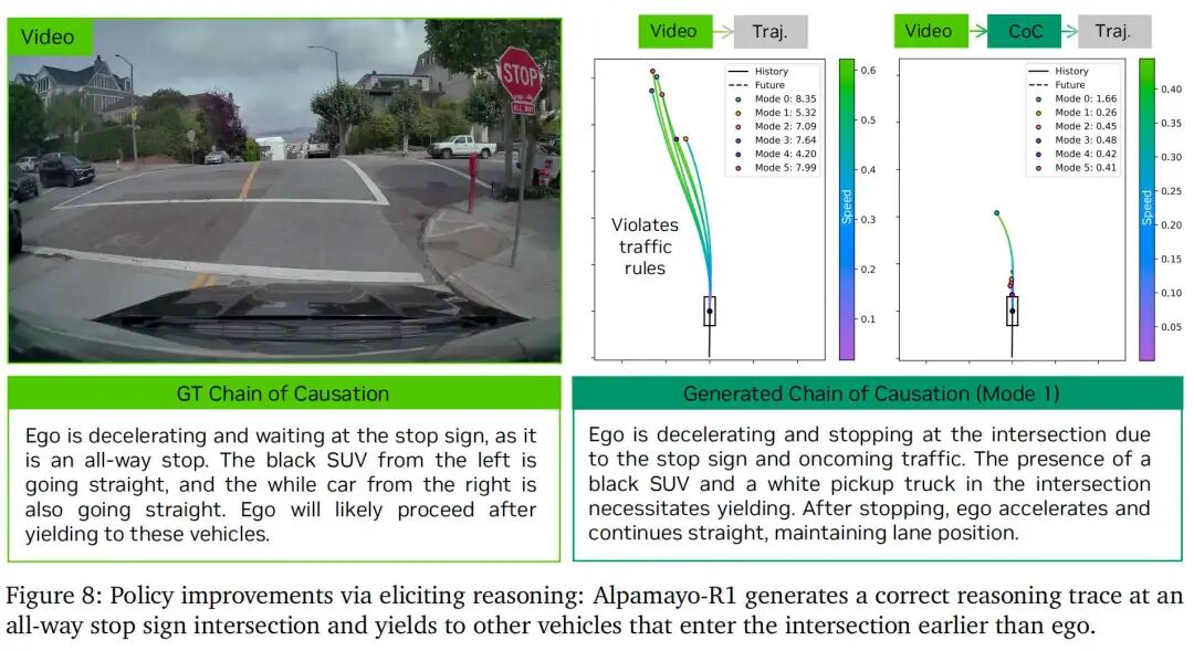 这些结果证实:模型容量与领域专用预训练均为实现优异驾驶性能的关键,也进一步验证我们选择Cosmos-Reason作为Alpamayo-R1主干网络的合理性——其为模型提供了通用视觉-语言模型所不具备的物理智能基础能力。