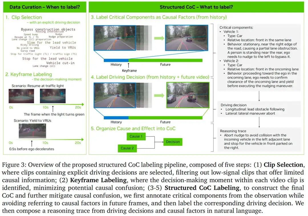 为解决上述问题,本文提出一种标注框架,可在推理轨迹中强制加入显式因果结构。首先,本文定义了一套全面的高阶驾驶决策集合,这些决策与低阶自车轨迹直接对应;每个推理轨迹均关联一个显式驾驶决策,并仅包含驱动该决策的因果因素。通过精心选择关键帧以分割视频的历史与未来片段,确保所有因果因素均来自可观测的历史窗口,从而避免因果混淆。该设计确保每个推理轨迹均以决策为核心且具备因果关联,捕捉简洁可解释的因果关系,而非冗长的描述性叙述。由此构建的数据集称为“因果链(Chain of Causation, CoC)数据集”,可为学习决策因果性提供清晰监督,使推理型VLA在车载推理时能高效推理特定驾驶动作的原因。图3展示了该标注流程的整体框架。