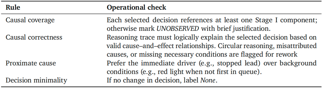 确定驾驶决策与关键组件后,需将其以自然语言组织为连贯的CoC推理轨迹,捕捉所选决策背后的因果逻辑。由此,结构化CoC协议可确保: