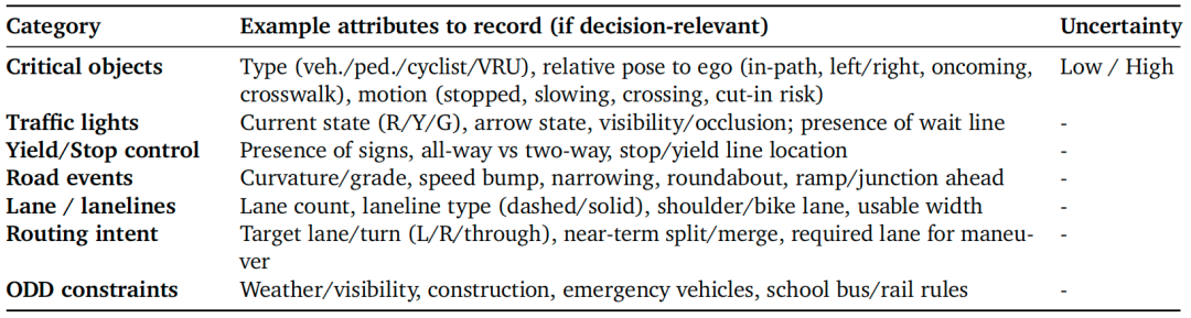 与闭集驾驶决策不同,因果因素定义为开放集,其类别与示例属性如表2所示。这种设计允许人工标注者或自动标注流程灵活指定仅影响驾驶决策的关键元素,同时保持输出结构化。