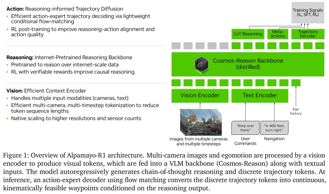 (2)模块化VLA架构:整合为物理智能(Physical AI)应用预训练的视觉-语言模型Cosmos-Reason,以及基于扩散模型(diffusion-based)的轨迹解码器,可实时生成动态可行驶的规划方案;