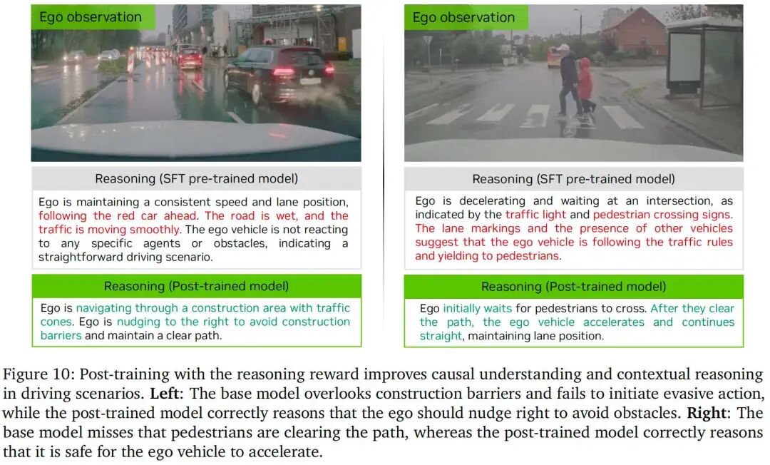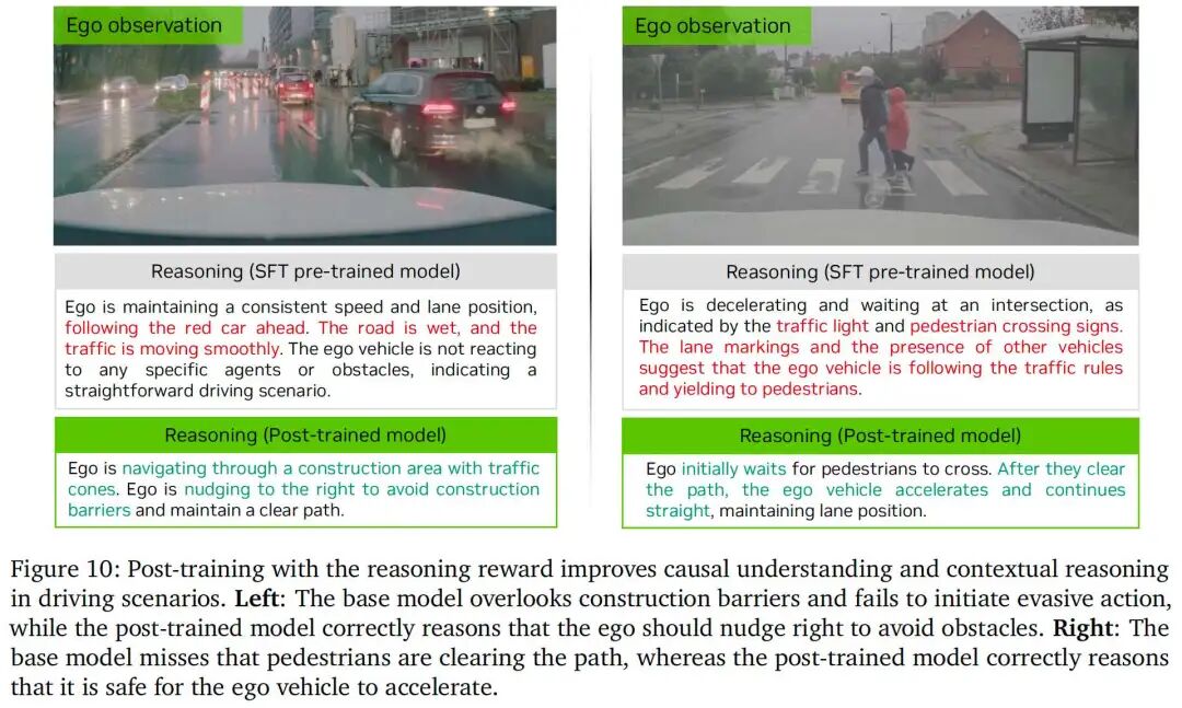 右图(行人场景):两名行人即将离开车道,有监督微调预训练模型忽略这一场景线索,未预判自车需准备加速;后训练模型则正确识别“行人已离开可行驶区域”,推理“自车可安全恢复行驶”。
