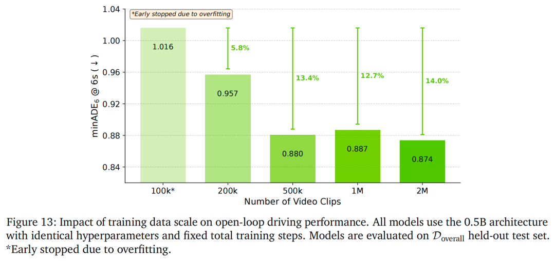 如图13所示,性能随数据规模增大而持续提升,证明数据多样性对自动驾驶的价值: