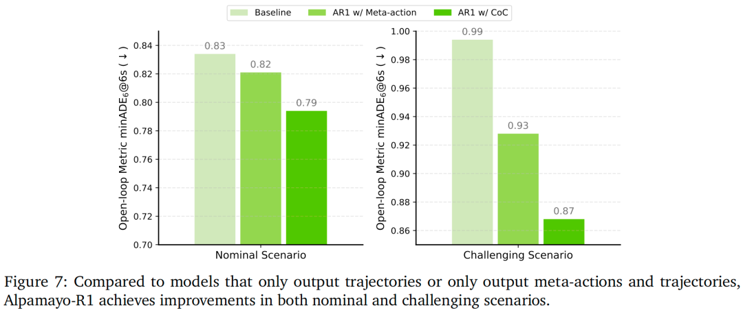 通过大量开环与闭环(仿真及实车)评估,本文证明AR1相较于端到端基准模型实现了显著性能提升,且在罕见、安全关键场景中的收益最为显著,同时保持了实时推理性能(端到端推理耗时99毫秒)。