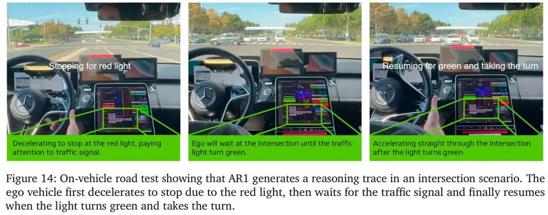 为验证AR1的真实世界部署能力,我们将模型部署于测试车辆,在城市驾驶环境中开展道路测试。车辆成功完成复杂城市场景的无人工干预导航,证明模型能处理仿真之外的真实驾驶条件。图14展示一个路口场景:AR1准确识别交通状况,生成清晰简洁的推理轨迹,并执行相应驾驶动作。这些测试证实:仿真中的性能提升能成功迁移到真实世界自动驾驶场景。