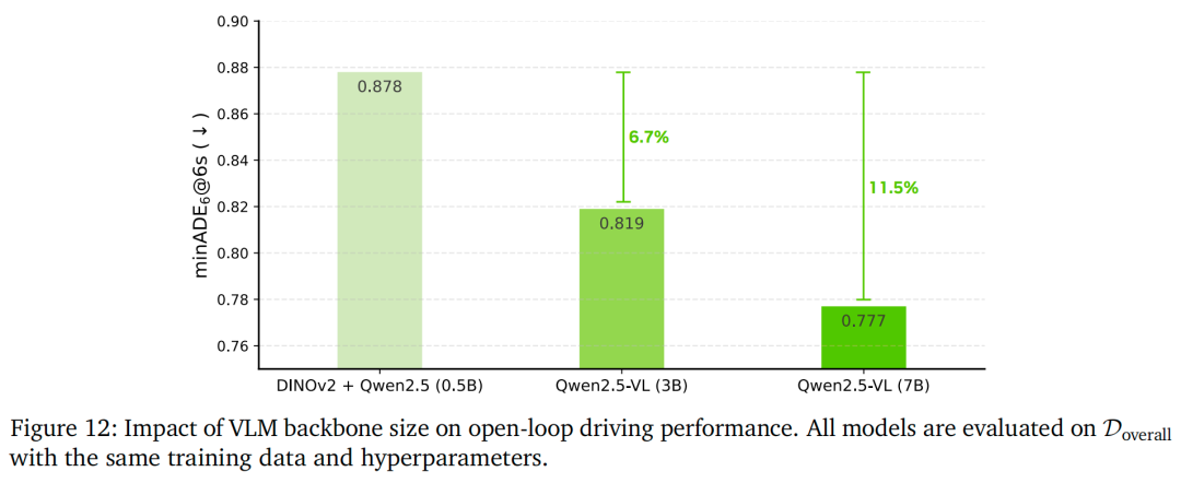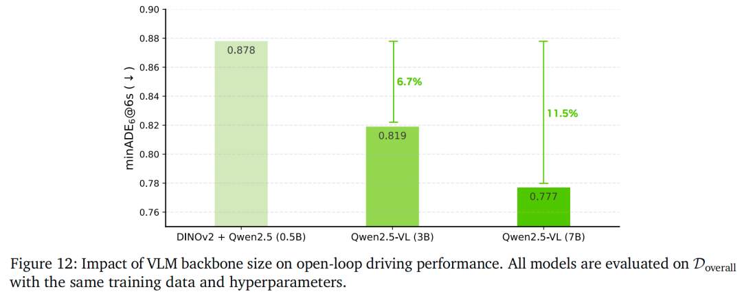 为研究模型容量对驾驶性能的影响,我们首先采用通用视觉-语言模型进行基准缩放实验。具体评估三种不同主干网络规模的架构:0.5B、3B与7B参数。其中,0.5B模型采用DINOv2视觉编码器与Qwen2.5-0.5B语言模型;3B与7B模型则分别采用Qwen2.5-VL-3B与Qwen2.5-VL-7B。为保证消融实验的公平性,所有变体均在相同数据上训练(训练预算低于主模型),并在