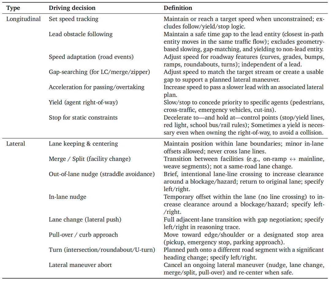 表1 用于将推理轨迹锚定到显式控制意图的封闭集驾驶决策(纵向与横向)