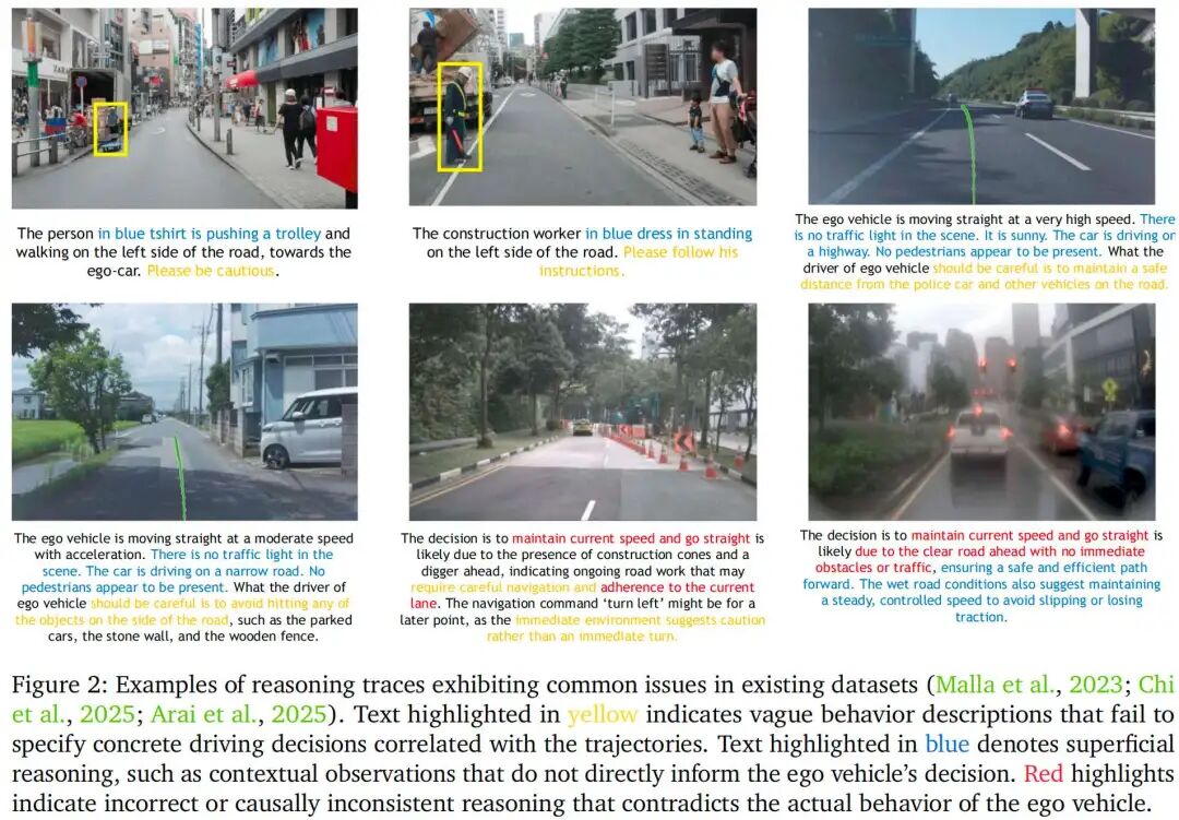 (2)推理流于表面:部分推理轨迹仅描述场景观测或假设性因素,与自车行为缺乏直接因果关联,对提升训练后驾驶性能的帮助有限;