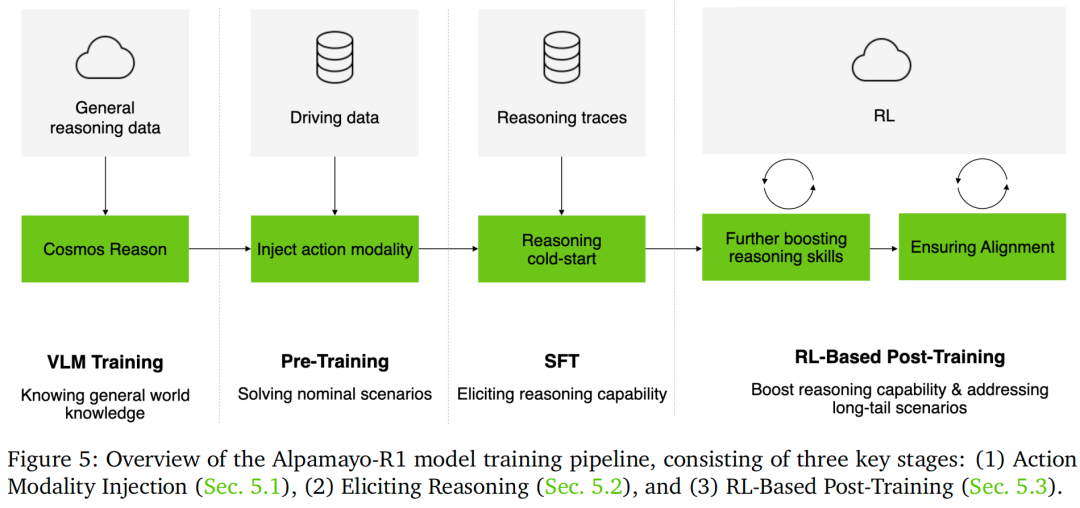 设计多阶段训练策略:以Cosmos-Reason VLM为主干网络,注入动作模态以实现轨迹预测,通过在CoC数据集上的有监督微调激发推理能力,并采用强化学习(RL)提升推理质量、推理-动作一致性及轨迹质量。