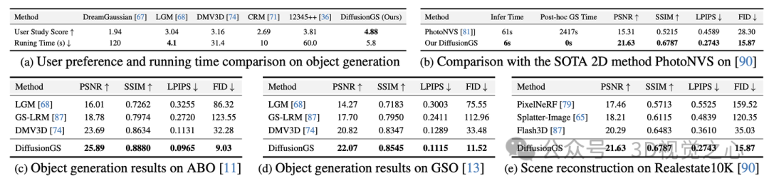 定量实验对比如表1所示,我们的方法在不借助 2D image diffusion prior 和 monocular depth estimator 的情况下比 SOTA 方法达到更好的测试指标和更快的生成速度。