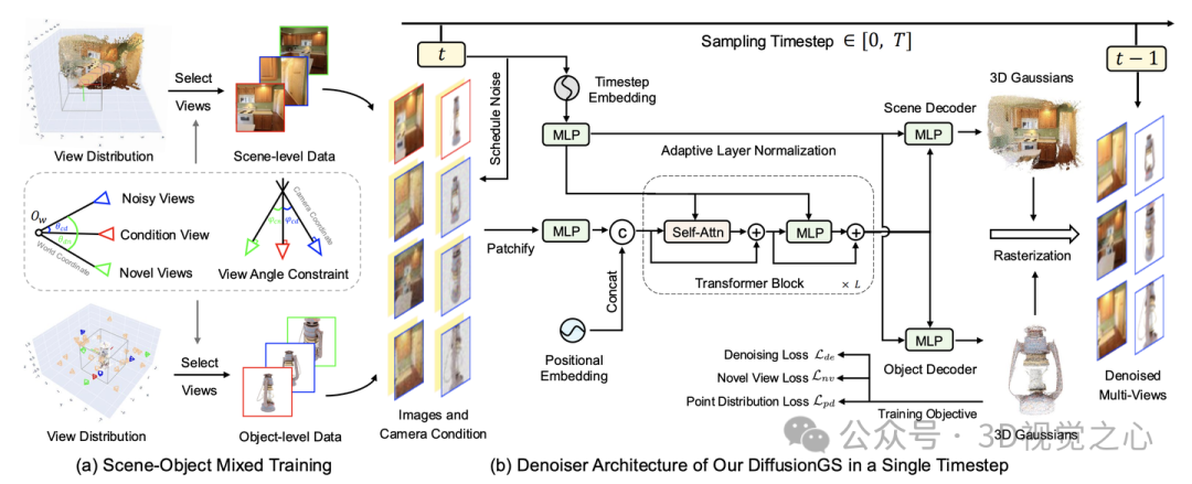 图11. 本文提出的 DiffusionGS 的算法流程图 我们的方法 DiffusionGS 算法流程大体如图11所示,主要由 (a) 场景-物体混合训练策略和 (b) 我们的 3D Diffusion 框架。本小节首先给大家介绍 (b),然后再介绍 (a)。