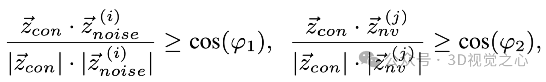 由于我们的model是 pixel-space 的,没法使用pre-trained image diffusion prior,因此需要较多的3D数据来学到较好的 3D prior。然而3D训练数据本身并不是很多,尤其是 scene-level 的数据,只有9万多个。因此,接着我们又设计了一种场景-物体混合训练策略来充分利用各类三维训练数据。我们首先对训练的视角夹角加一些限制,如图11 (a) 所示,主要控制两类夹角,第一类夹角是 noisy view, condition view, 和 novel view 的位置向量之间的夹角: