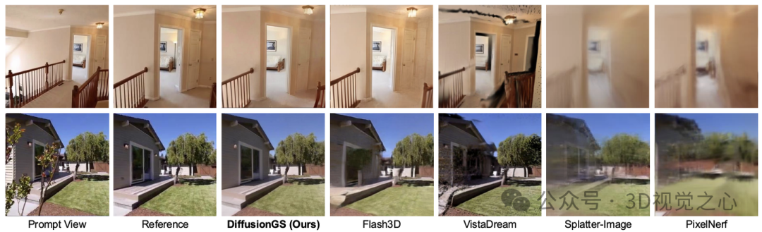 图14. scene-level 单视角重建对比示意图 视觉对比如图 13 和 14 所示,我们方法生成更清晰,三维一致性更好的新视角图像,伪影和模糊也更少。