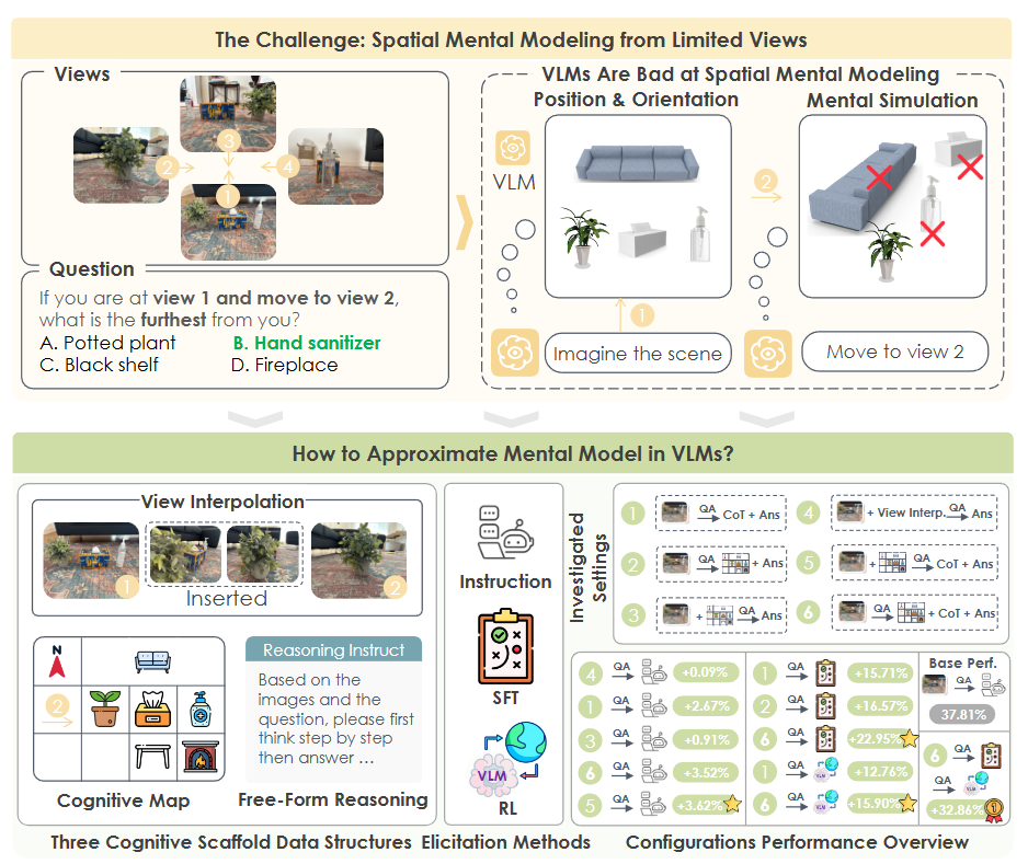 图2|上:现有视觉语言模型(VLM)在 MINDCUBE 基准上难以维持连贯的空间心智模型,面对遮挡与视角变化时表现近乎随机。下:研究者探索了帮助模型“想象空间”的两类策略——外部策略(扩展视角数量、引入认知地图)与内部策略(微调模型、激活内在地图生成)。结果显示,“生成认知地图再进行推理”的联合框架效果最佳,准确率提升达 +32.9%,显著增强了模型对不可见空间的理解与想象能力