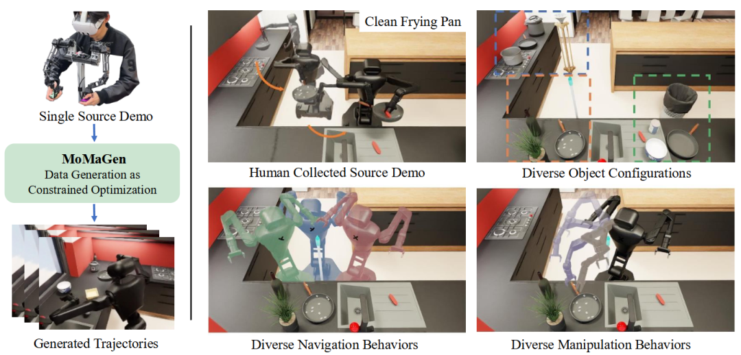 图1|MOMAGEN 的核心思路演示:系统仅依赖一条人工采集的示范,即可通过“约束优化”生成大规模、多样化的机器人演示数据。上方展示了原始的人类清洗平底锅示例(左)及经过随机物体姿态与干扰物扰动后的多场景扩展(右);下方展示了不同的机器人底盘位置与双臂运动轨迹。可以看到,MOMAGEN 能在复杂、变化的场景中自主生成符合任务约束的多样化操作示范