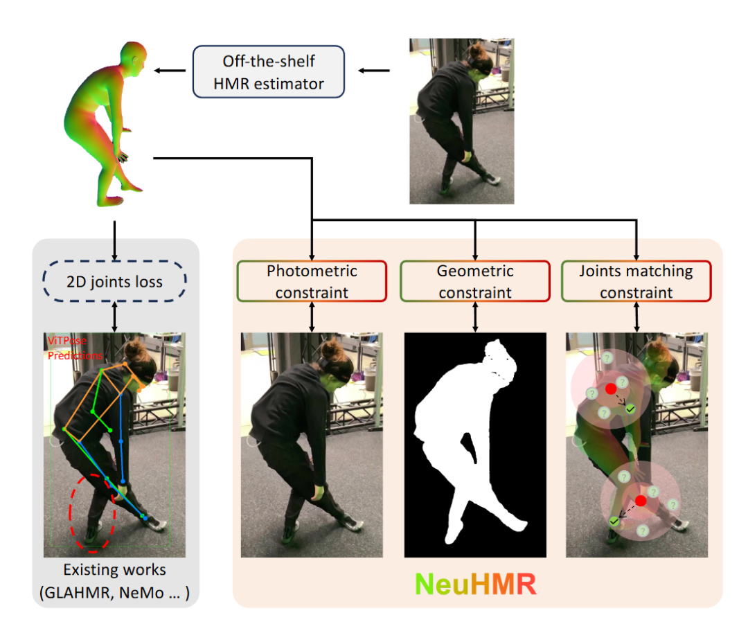 图5|以往的人体网格重建方法通常依赖外部关键点检测器提供的二维伪标注进行优化,但这些检测在复杂姿态下容易出错(如图左)。NeuHMR 摒弃了这种依赖,转而利用基于神经渲染的低层视觉约束来直接优化人体姿态与网格形状,实现了更精细、更稳定的姿态重建效果