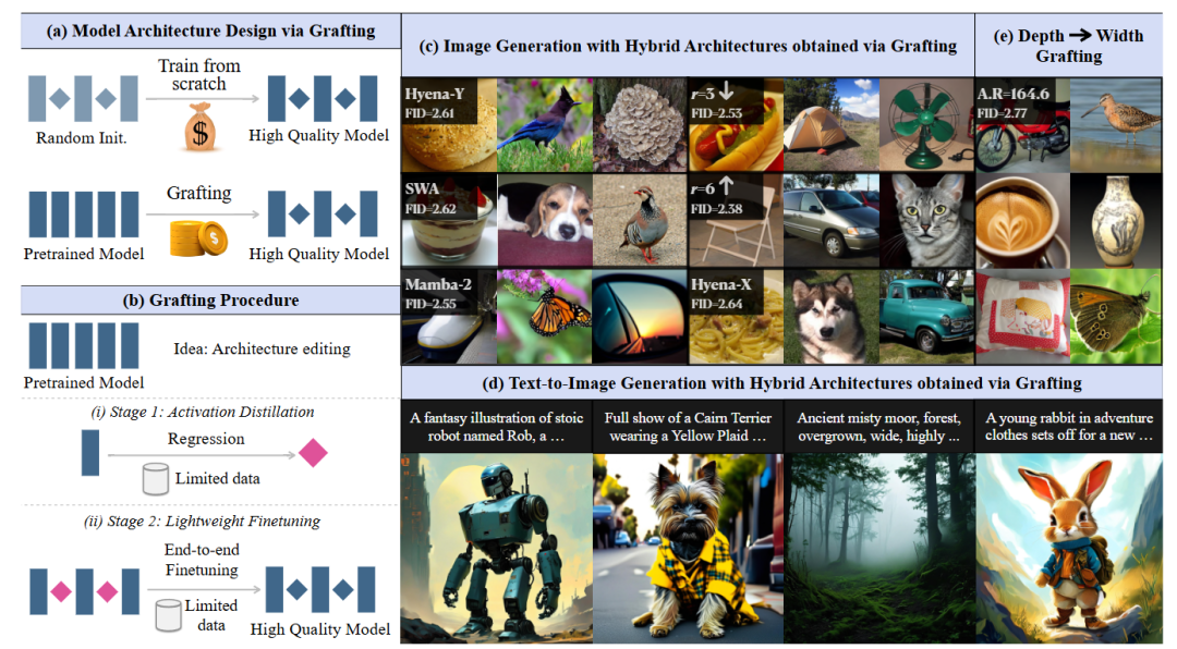 图4|Grafting 方法概览:该研究提出在无需重新预训练的前提下,通过直接修改已训练扩散 Transformer 的计算图,实现新架构的快速“嫁接”与验证。(a,b) 展示了通过 grafting 编辑预训练模型以探索新结构设计的思路;(c,d) 展示了基于混合架构生成的类别条件图像与高分辨率文本生成样例(2048×2048);(e) 展示了模型深度从 28 层缩减至 14 层后的效果对比。研究核心在于探讨如何在有限计算预算下安全地替换算子(如将多头注意力或 MLP 模块替换为卷积单元),并控制累积误差,从而以最小代价高效探索扩散模型的结构潜力