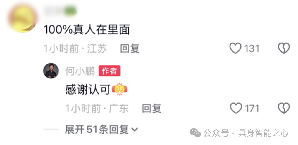不过,面对铺天盖地的讨论,小鹏似乎一点也不慌。在一个网友评论:「100% 真人在里面」的下面,何小鹏回应道:「感谢认可。」