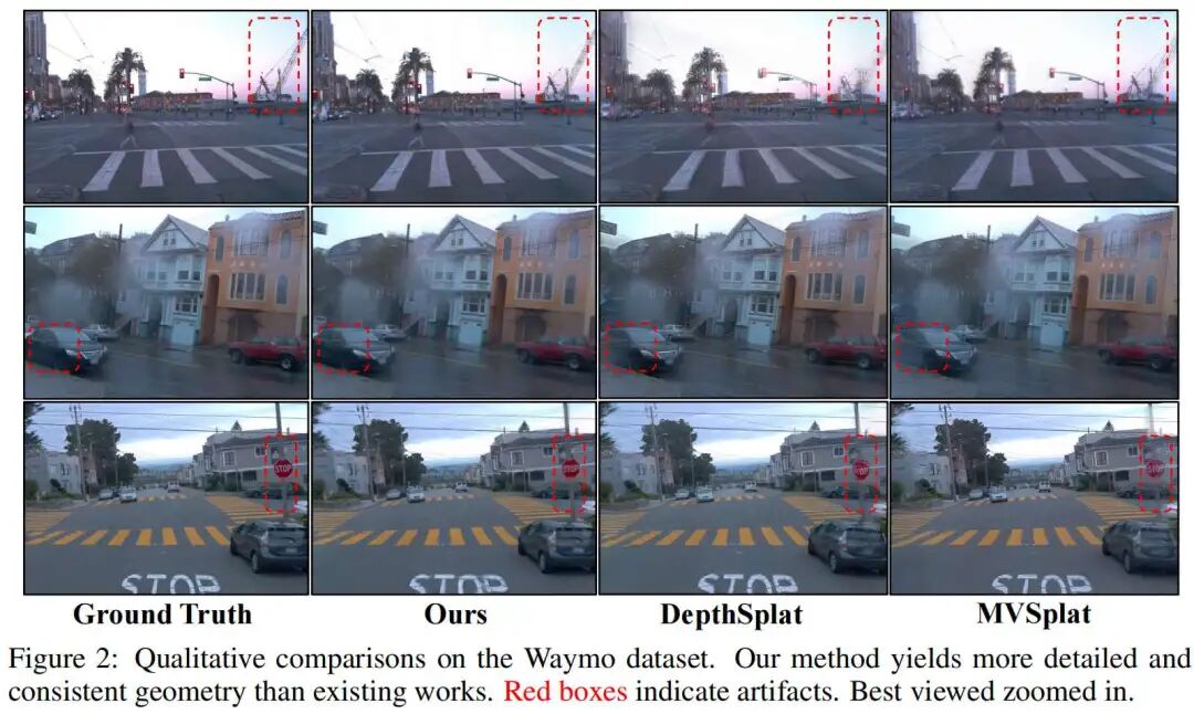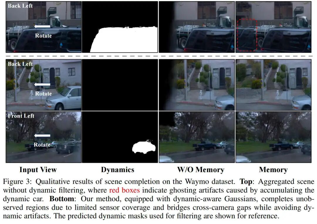 动态感知高斯补全结果:UniSplat 可预测每个高斯基元的动态属性,无需人工标注即可在推理阶段实现场景的渐进式构建。如图 3所示:上方为无动态过滤的基线方法结果,由于动态目标的累积,出现了“重影伪影”;而我们的方法在补全缺失区域的同时,有效抑制了此类伪影。下方结果表明,UniSplat 成功补全了两种典型场景下的未观测区域:一是 Waymo 5 相机系统无法覆盖 360° 视场的区域,二是跨相机的视野盲区。此外,模型能清晰区分动态行驶车辆与静止停放车辆,证明其可有效利用时间上下文信息。