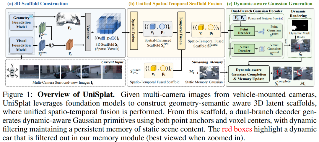 UniSplat 针对多相机帧的连续流进行处理,维持场景随时间演化的统一 3D 潜在表示。如原文图 1 所示,每个时间步从多视图图像的 3D scaffold构建开始,生成编码场景几何与语义的 3D 体素(潜在scaffold);随后执行统一时空融合,整合当前Scaffold内的跨视图信息与前一时间步的潜在Scaffold;最后通过双分支解码器实现动态感知高斯生成,同时维护静态高斯的时间记忆库,以解决稀疏相机输入和有限视场导致的场景覆盖不完整问题。