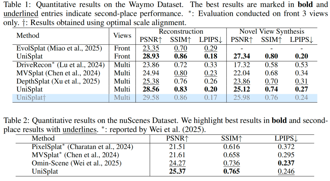 Waymo 数据集结果:我们将 UniSplat 与当前主流的稀疏视角重建方法进行对比,包括 MVSplat、DepthSplat、EvolSplat和 DriveRecon。对于通用方法 MVSplat 和 DepthSplat,本文基于其官方代码库在 Waymo Open 数据集上重新训练;对于面向驾驶场景的方法 EvolSplat 和 DriveRecon,我们在验证场景上评估,并调整其输出分辨率以确保对比公平性。定量结果汇总于表 1,UniSplat 在输入视图重建和新视角合成两项任务的所有指标上,均持续优于所有基线方法。定性对比结果如图 2所示:MVSplat 和 DepthSplat 难以重建精细几何细节,且在相邻相机重叠区域存在明显伪影,而我们的方法能生成视觉连贯、质量更高的结果。此外,我们还报告了一个优化变体(标记为†)——该变体采用基于 LiDAR 点云计算的最优单相机尺度,进一步提升了性能。