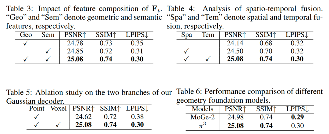 双分支高斯解码器的消融:表 5 验证了双分支解码器的设计合理性:仅使用点锚定高斯(Point 分支)时,性能显著下降——PSNR 降低 0.46 dB,SSIM 降低 0.02,LPIPS 误差增加 0.08,这表明体素生成高斯(Voxel 分支)在填补稀疏覆盖区域、提升场景完整性方面至关重要。由于仅体素分支在长距离渲染任务中性能极差,所有指标均表现糟糕,因此未将其纳入对比。