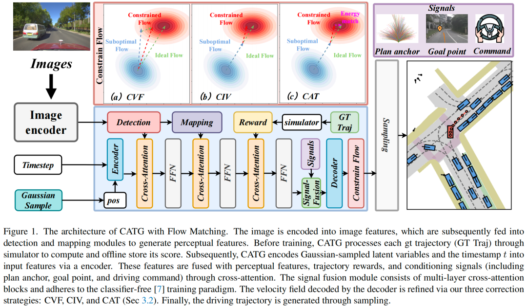 为解决这些局限,北交、轻舟、燕山大学、澳洲昆士兰大学的团队提出了CATG——一种基于Constrained flow matching的规划框架。具体而言,CATG显式建模flow matching过程,这一过程本质上可缓解mode collapse,并支持多种条件信号的灵活引导。我们的核心贡献包括:其一,在flow matching过程中创新性地引入显式约束,确保生成轨迹符合关键的安全规则和运动学准则;其二,将驾驶激进程度参数化为生成过程中的控制信号,实现对轨迹风格的精准调控。值得注意的是,在NavSim v2挑战赛中,CATG以51.31的EPDMS得分获得亚军,并荣获创新奖。