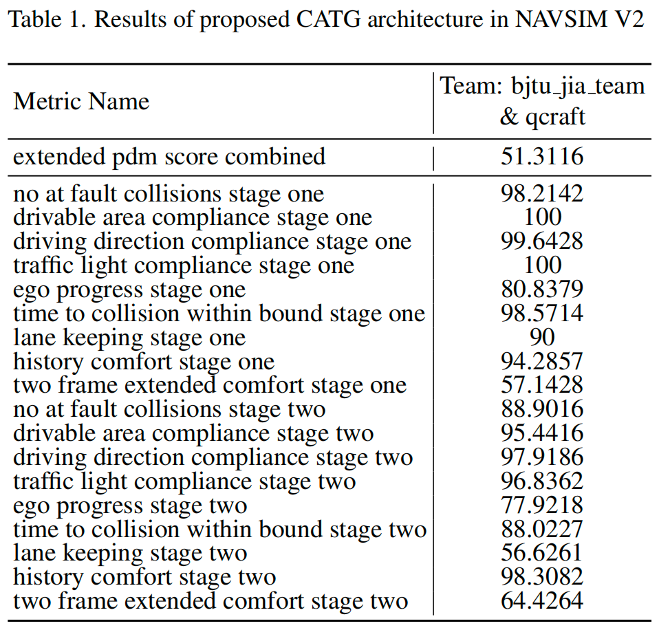 CATG在ICCV NAVSIM V2端到端驾驶挑战赛中经过了广泛评估,展现出卓越的规划精度和对分布外数据的稳健泛化能力。结合开源评分模型,CATG取得了51.31的EPDMS得分。