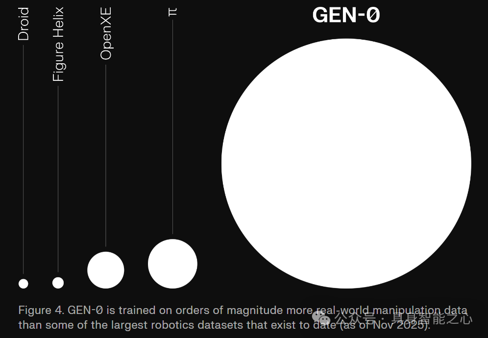 突破数据瓶颈:GEN-0基于超27万小时真实世界异构操控数据进行预训练,该数据集正以每周1万小时的速度持续扩张且不断加速。