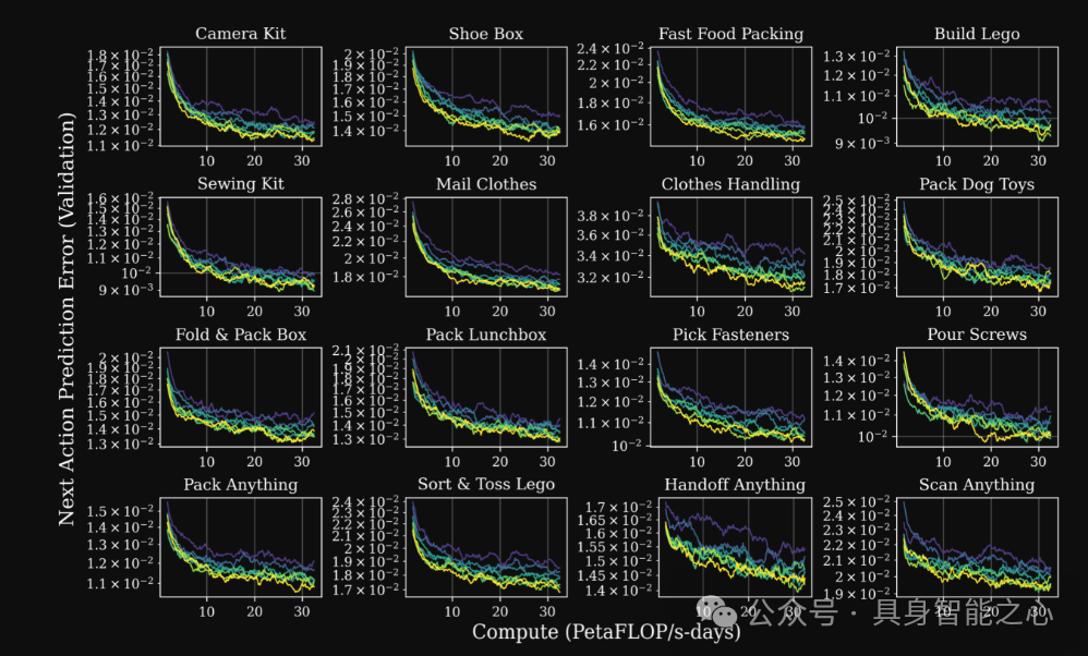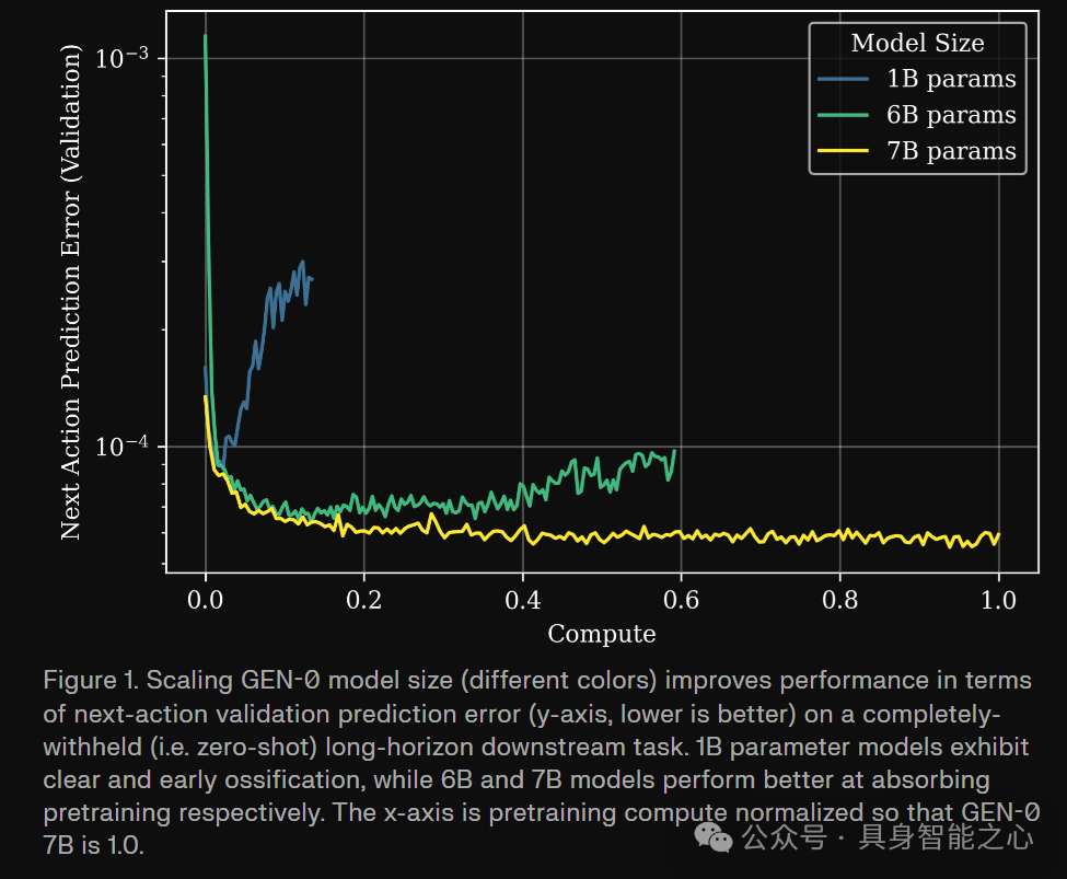 规模化实验表明,GEN-0模型必须具备足够大的参数量才能吸收海量物理交互数据。研究还发现较小模型在数据过载时会出现类似"固化"现象,而更大模型则持续提升,这揭示了模型智能容量存在惊人的"相变"规律: