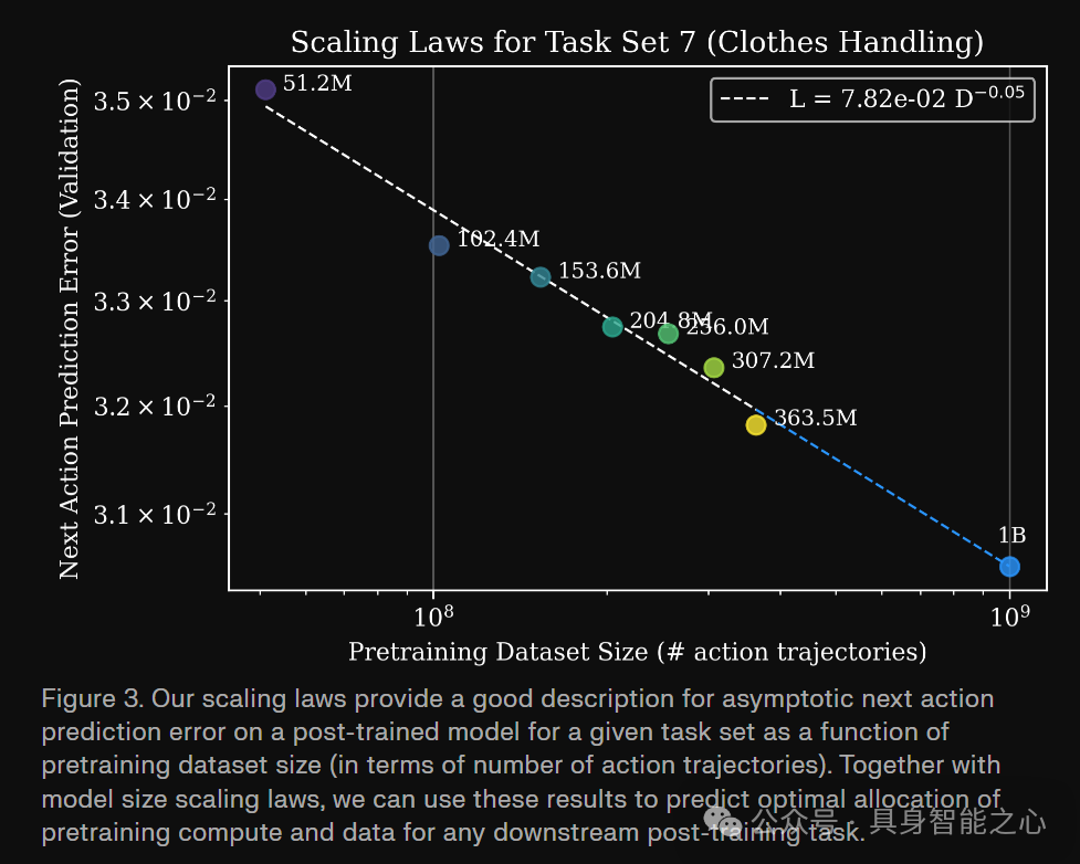 模型性能可通过幂律关系进行准确预测(图3)。基于该定律,能够解答诸如"要达到特定水平的下一动作预测误差,需要多少预训练数据"或"增加预训练数据可等效替代多少后训练数据"等关键问题。在给定下游任务固定数据D与微调预算的前提下,对于不同规模的预训练数据集,下游任务的验证误差L(.)可通过以下形式的幂律关系进行预测: