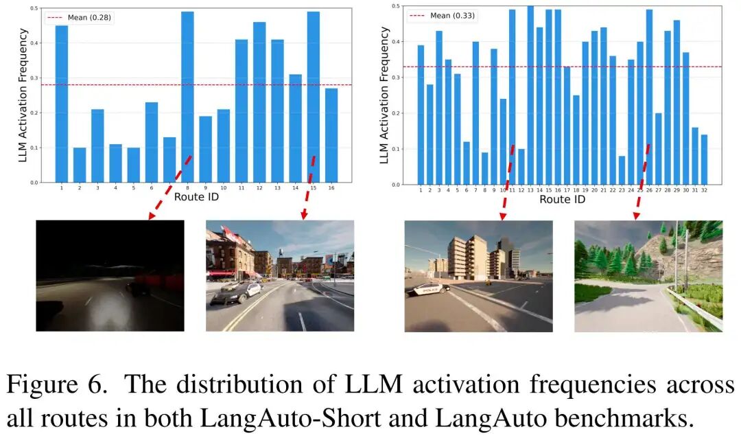 此外,本文分析了LLM在LangAuto-Short和LangAuto基准测试所有路线上的激活频率分布,如图6所示。激活频率范围在0.1到0.5之间,表现出有效的稀疏性和动态适应性,平均激活率分别为0.28和0.33。值得注意的是,在复杂路线(如密集城市街道、夜间环境或山路)中观察到更高的激活频率,这验证了本文针对复杂场景自适应启用LLM的设计原则。