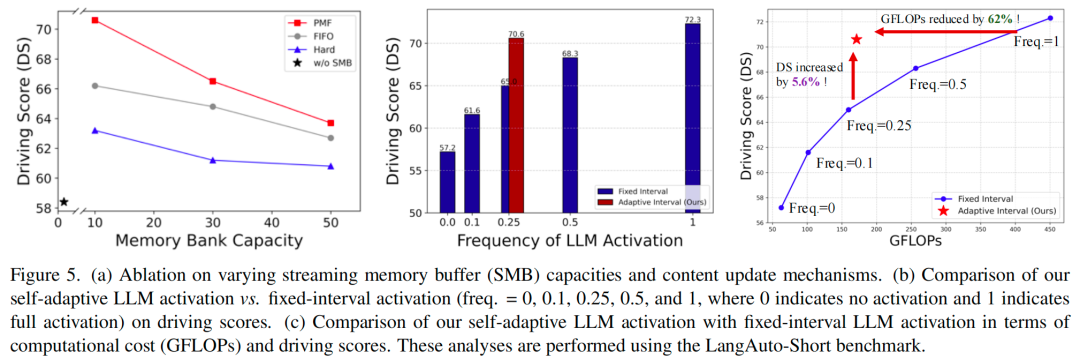自适应协作分析:本文将自适应LLM激活策略与不同频率的固定间隔激活进行对比。如图5(b)所示,更高的激活频率总能带来更稳定、更稳健的驾驶性能。本文的自适应LLM激活机制能够动态响应关键场景,实现与连续LLM激活相当的性能,同时平均激活频率仅为0.28。图5(c)进一步表明,本文的方法在驾驶性能和计算效率之间实现了最优平衡,与连续激活相比,GFLOPs降低了62%,同时与相近频率的固定间隔方案相比,驾驶分数提升了5.6%。